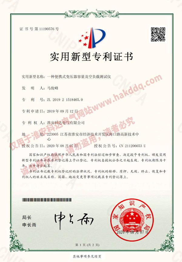 便攜式變壓器容量及空負(fù)載測(cè)試儀專利證書