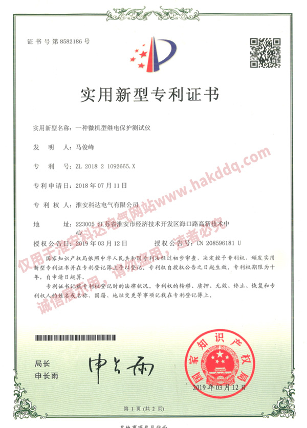 微機(jī)型繼電保護(hù)測試儀專利證書